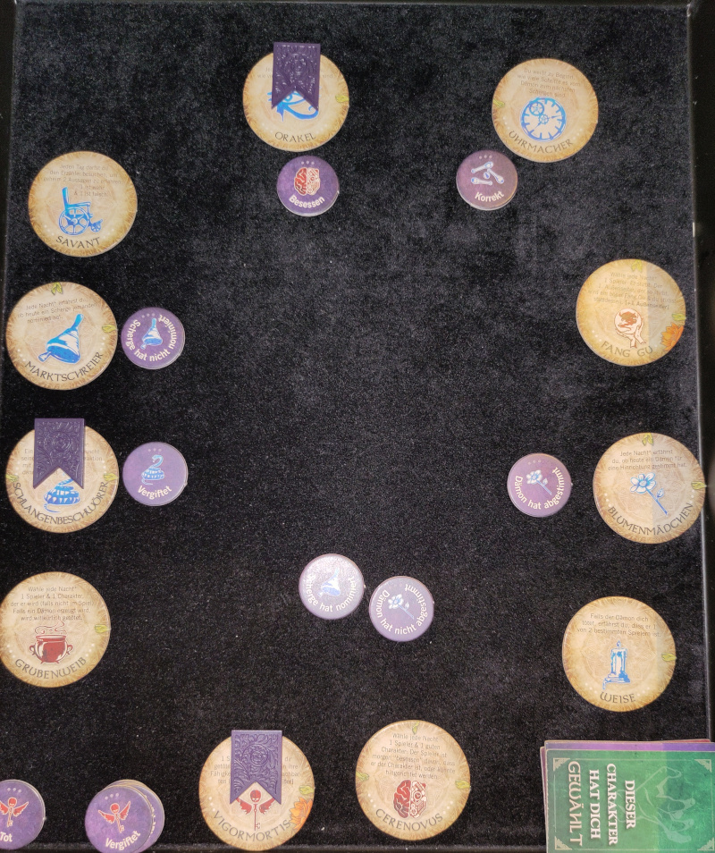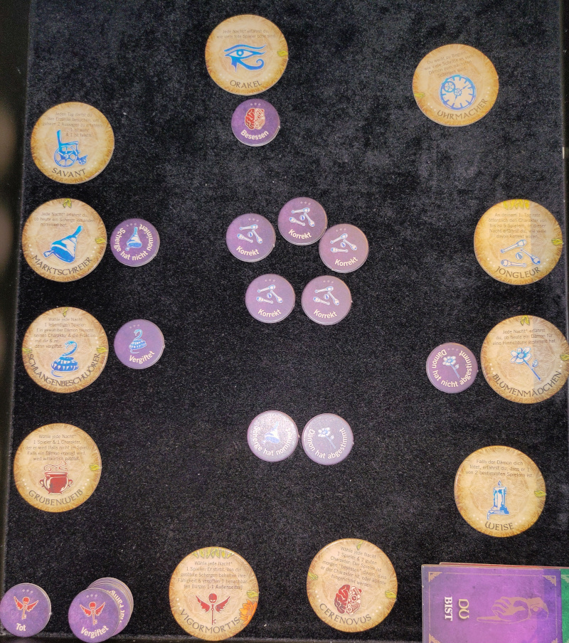 - Zweite Nacht: Habe ich wieder keine Infos bekommen, aber hatte viel Zeit zum Nachdenken. Meine Gedanken waren: Hat Yvonne gelogen und sich die Geschichte ausgedacht? Die Bluffs waren zu präzise dafür. D.h. Felix war nicht der neue Dämon und somit ein guter Spieler. Bleibt die Frage wer ist der neue Dämon und welche Schergen sind im Spiel, die Personen waren bekannt als Martin und Anke.