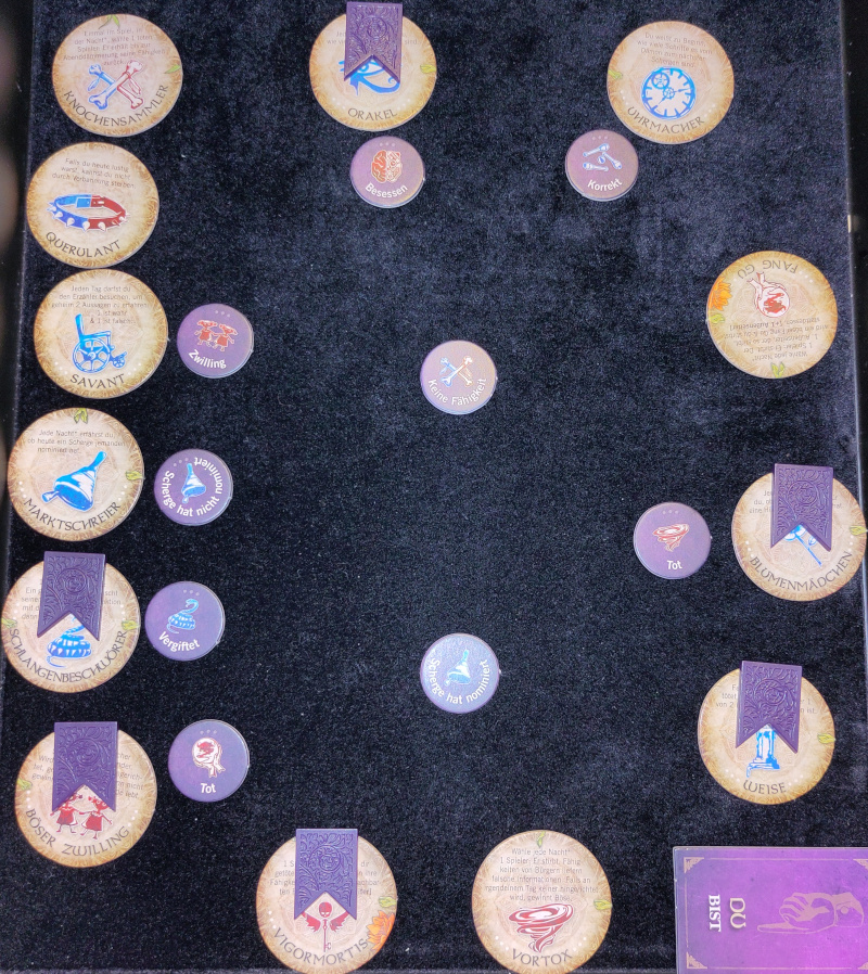 Die erste Nacht begann gleich mit einem Paukenschlag, als der Schlangenbeschwörer den Vigormortis auswählte und folglich die Rollen tauschte. Alter und neuer Dämon waren sichtlich erstaunt ob dieser unerwarteten Wendung. Der Cerenovus machte noch das Orakel besessen davon, der Träumer zu sein – ein wahrer Glücksgriff, wie sich am nächsten Tag herausstellte. Der Uhrmacher lernte ein – vor dem Wechsel und nach dem Wechsel – korrektes „1 Schritt vom Dämon zum nächsten Schergen“.
