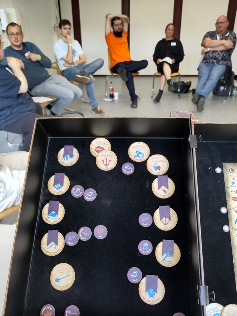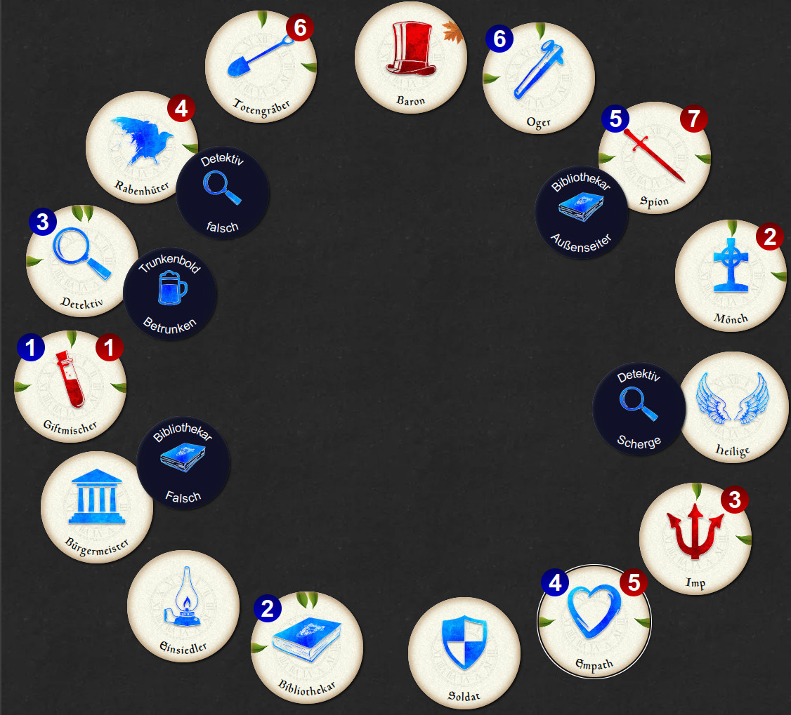 Danach habe ich mich etwas zurückhalten und auch nicht mit „meinen“ Schergen Kontakt aufgenommen, sondern lieber die gute Bürgerin gespielt und Verwirrung gestiftet. Deshalb habe ich bei den Abstimmungen immer probiert, meine Schergen und den guten Dämon irgendwie zu schützen – Minh hat da unbewusst gut geholfen.
