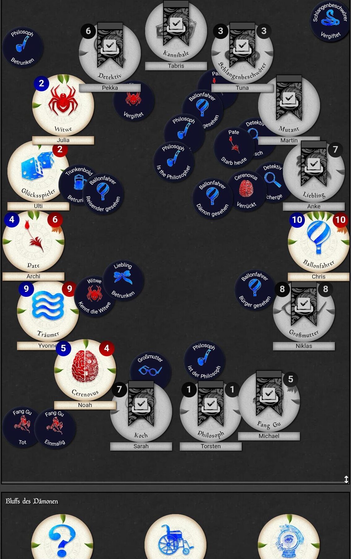 - Zweite Nacht: Habe ich wieder keine Infos bekommen, aber hatte viel Zeit zum Nachdenken. Meine Gedanken waren: Hat Yvonne gelogen und sich die Geschichte ausgedacht? Die Bluffs waren zu präzise dafür. D.h. Felix war nicht der neue Dämon und somit ein guter Spieler. Bleibt die Frage wer ist der neue Dämon und welche Schergen sind im Spiel, die Personen waren bekannt als Martin und Anke.