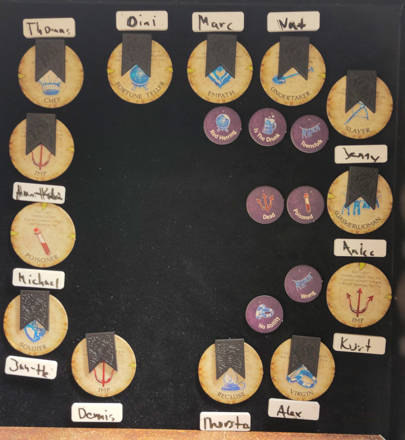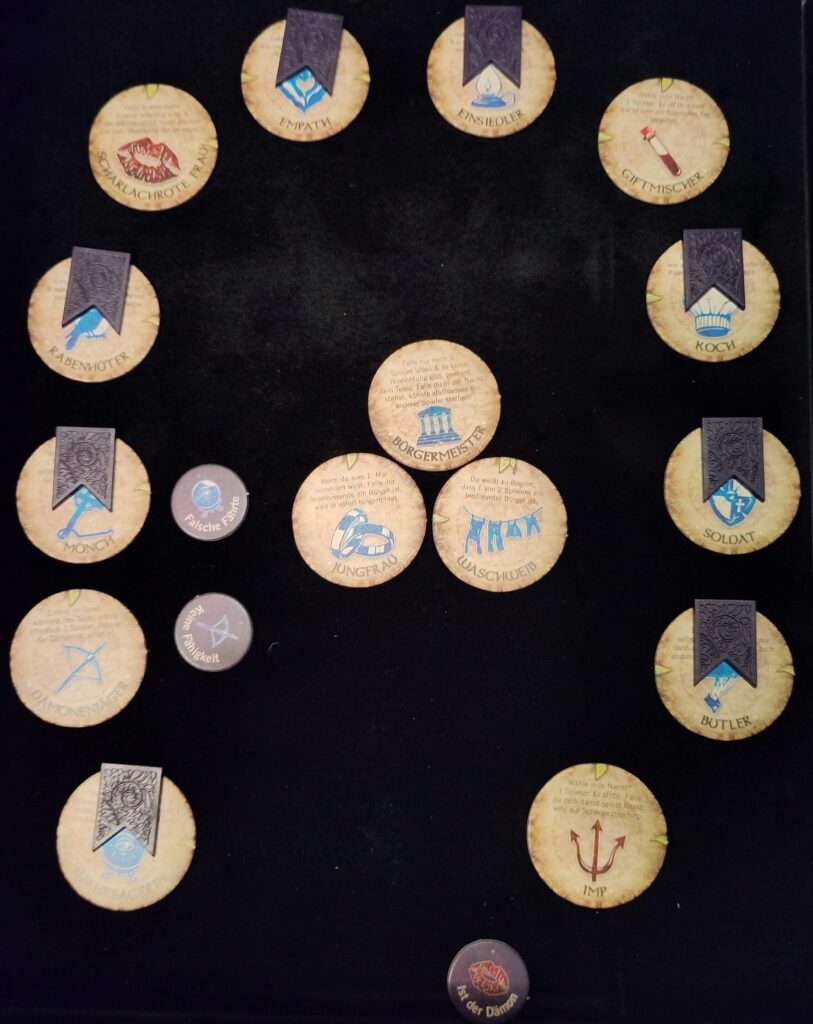 Wir hatten ein paar neue Gesichter dabei und auch die Dämonin war jemand, der zum ersten Mal spielte. Und wie so oft zeigt sich, dass bei Blood on the Clocktower Anfänger sehr gut mit erfahrenen Spielern in einer Runde sein können, da deren „chaotisches“ Verhalten für hinreichend viel Verwirrung sorgen, dass sie gar nicht mal gut bluffen müssen.