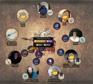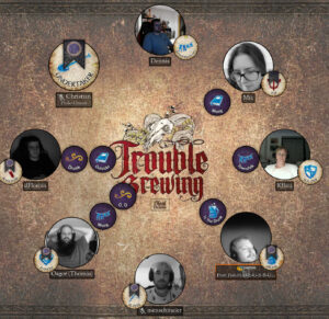 Gespielt wurde Ärger kocht hoch (Trouble Brewing), also das entspannte Einsteigerszenario. Die Bedienung klappte bis auf ein kleines Mikrofon-Problem sehr gut (gelöst durch ein Neuladen der Seite), so dass alle direkt in ihre Gespräche verschwunden sind…teilweise sogar schon bevor ich verkündet hatte, wer in der Nacht gestorben war!