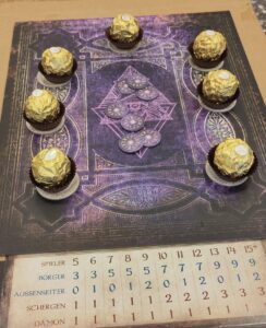 Kurz vor Weihnachten war es soweit: Blood on the Clocktower in Merzig. Sieben Spieler haben sich gefunden, die gemeinsam den Dämon zur Strecke bringen wollten. Alle? Nein nicht alle! Zwei Spieler der Spieler kämpften im Geheimen gegen die Dorfbewohner und wollten das Dorf vernichten.
